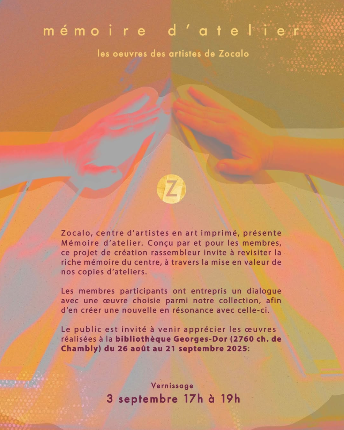 Vernissage ce 3 septembre 2025 de l'exposition collective Mémoire d'atelier auquel je participe avec le centre Zocalo. Jusqu'au 21 septembre.