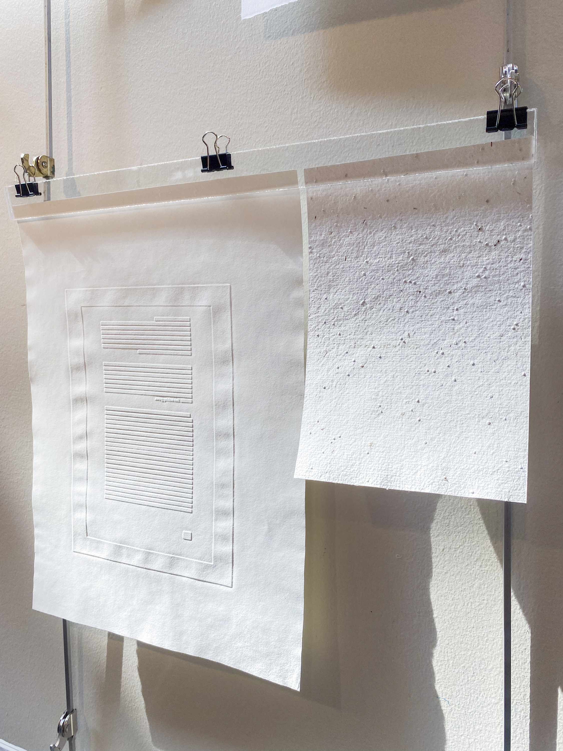 L’œuvre *That nothing grows* de Céline Huyghebaert m’a inspiré cette création intitulée: ...dans le blanc des yeux en impression numérique sur papier artisanal, un papier enrichi d’essence végétale et fabriqué par la papeterie Saint-Armand.